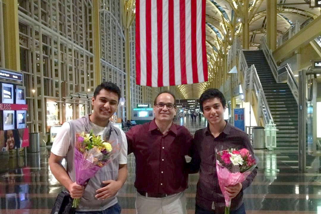 Attari (left) and his brother Kian (right) were reunited with their father, Dr. Mohammad K. Attari (center) in 2015 at Ronald Reagan Washington National Airport.
