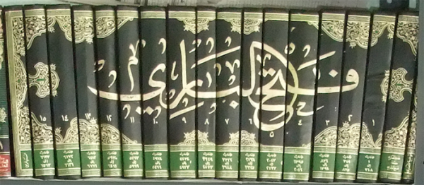 A printed version of "Fath al-Bari" on a bookshelf in an Arabic madrasa for middle-school students in Hyderabad, India. This classic work of Islamic thought is found in libraries, schools and bookstores across the Muslim world. (Photograph by Joel Blecher)