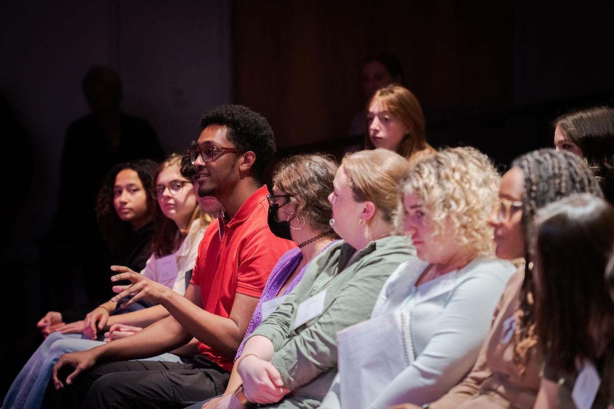 The talk resonated deeply with students, many of whom are themselves aspiring actors, writers, directors and producers. Nathan Desta, a first-year student majoring in theatre and communications, “almost passed out” when he found out he’d have the opportunity to sit a few feet from Washington and ask her questions. He asked Washington about character creation and specificity that elicited a memory of a role she’d struggled with at GW—a challenge Washington eventually addressed through the character's movement and posture, using physical choices she demonstrated for the student audience.
